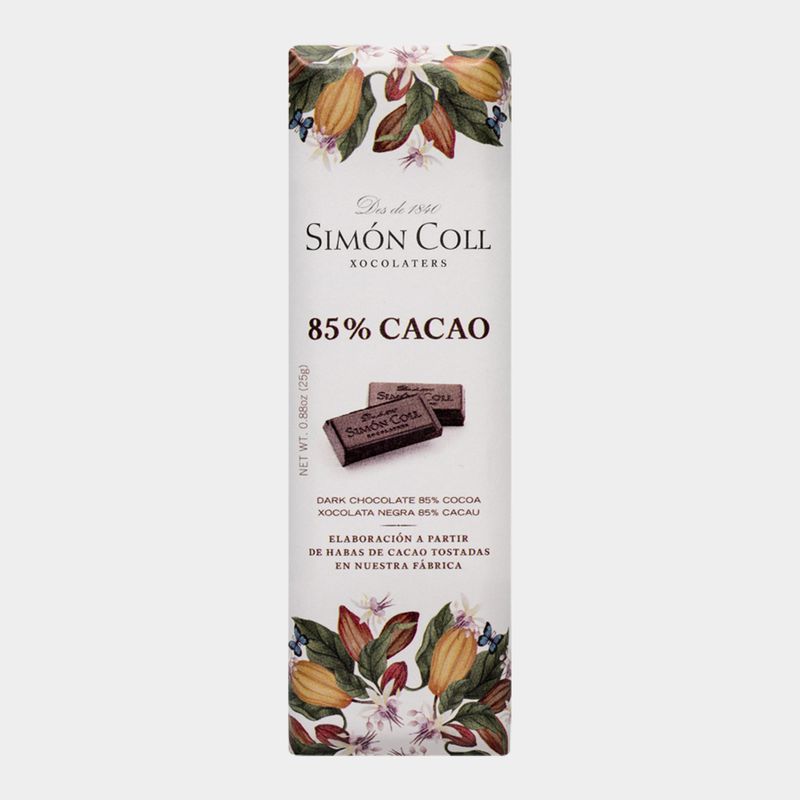 Fórmula 85% cacau. Elaborada amb ingredients naturals de gran qualitat i fabricada seguint el procés de selecció i torrat tradicional del gra a la nostra fàbrica Simón Coll. Aquesta rajola aporta tota la intensitat del cacau, juntament amb una gran cremositat, l'ideal per gaudir de la puresa del cacau amb el plaer d'un alt percentatge. Lliure de gluten i d'additius artificials. Es presenta en xocolatina de 25 g fàcilment divisible per degustar i gaudir millor de la xocolata.