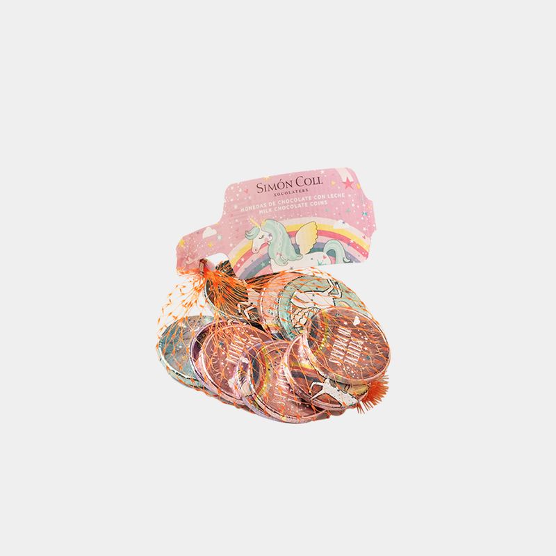 Bossa de malla amb 13 monedes de xocolata amb llet. Les monedes de xocolata estan embolicades amb alumini amb dissenys d'unicorns. 3 models diferents de monedes. Ideal per compartir en festes infantils amb més nens/es.