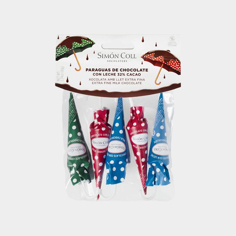 Bossa amb 5 paraigües de xocolata amb llet de 10g cadascun. Estan elaborats amb xocolata amb llet extrafina amb un 32% de cacau a través del nostre sistema tradicional de torrat i a partir del cacau en gra. Per als amants de la cremositat de la xocolata amb llet Simón Coll de sempre.