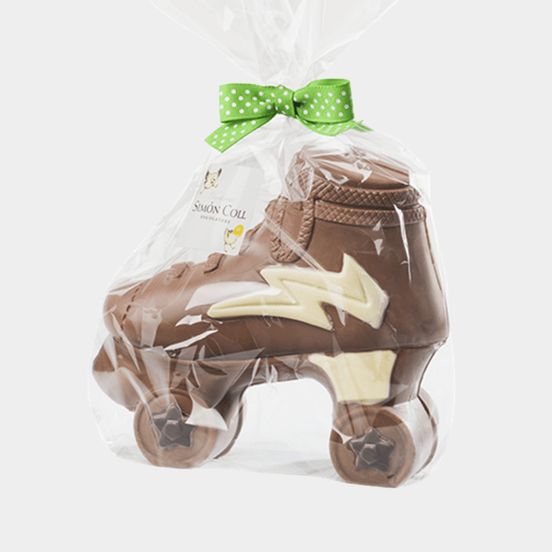 Figura hueca en forma de Patín de chocolate con leche pintada con chocolate blanco y negro. Ideal para los ahijados que les gusta el patinaje.