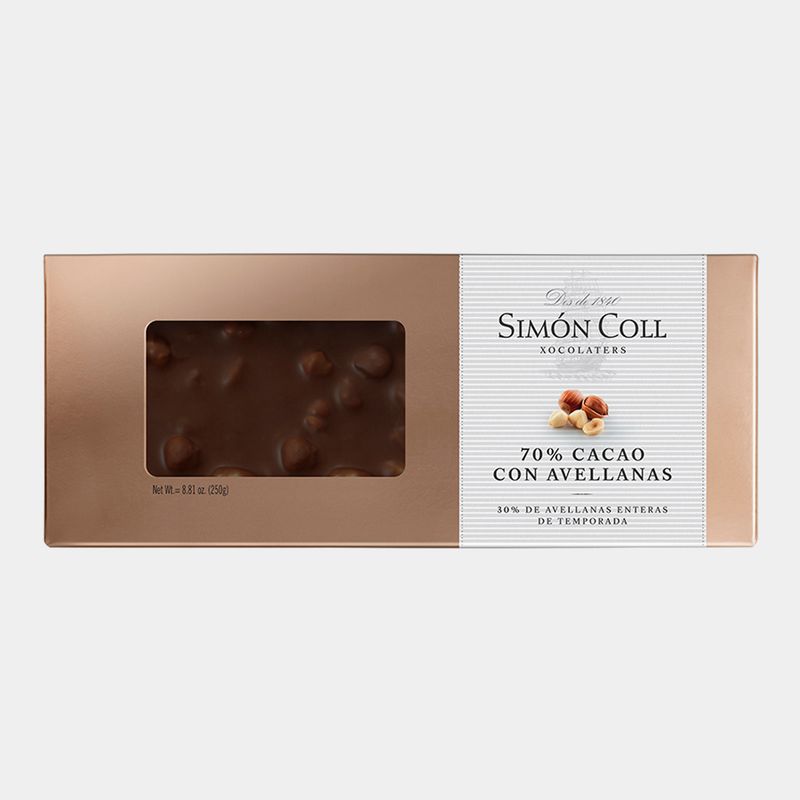Aquesta és la proposta per als paladars més gurmets que no renuncien a la intensitat de la xocolata. El torró de xocolata 70% cacau amb avellanes senceres serà un delit per a qualsevol moment de sobretaula. Combina la intensitat de la xocolata 70% amb l'efecte avellutat de les avellanes senceres de temporada.