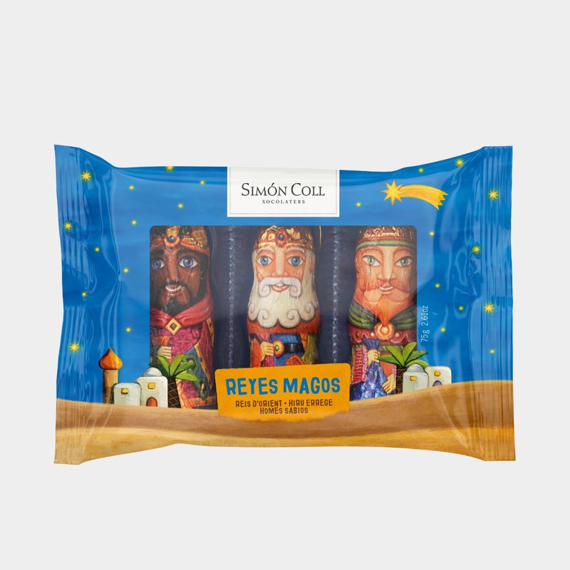 Tray with 3 hollow milk chocolate figures, wrapped in aluminium foil, decorated with each of the three kings. Ideal to decorate the Christmas tree, as each figurine has a thread to help you hang it, or to give as a present during "Reyes".