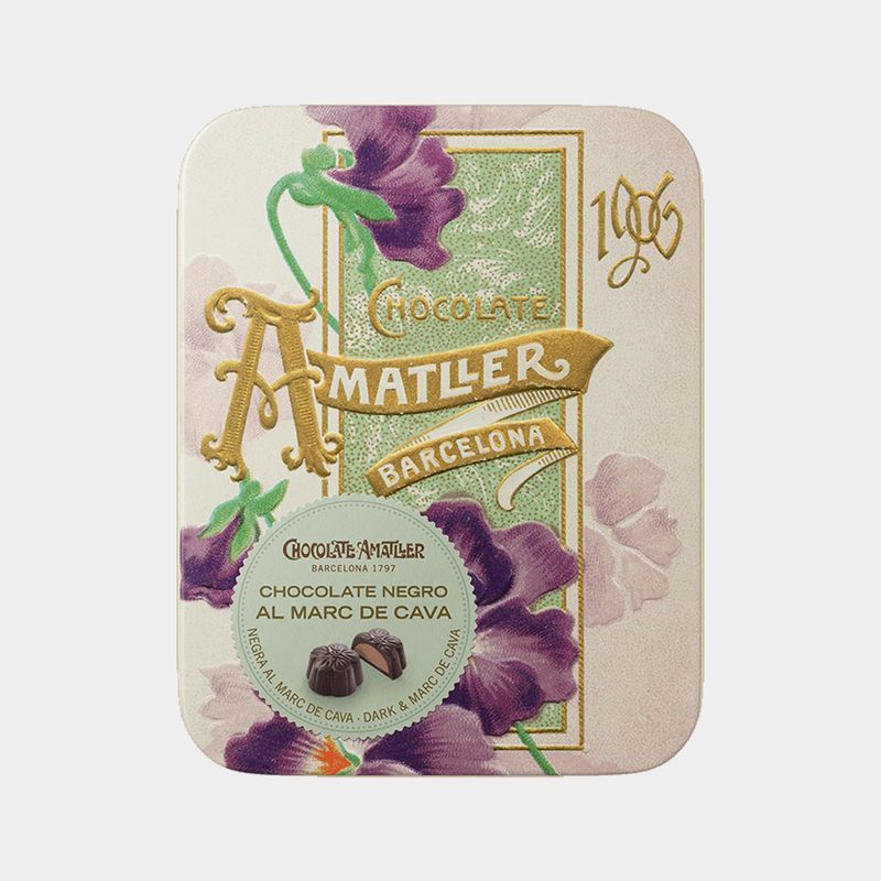 Chocolates covered in 50% cocoa chocolate with a Marc de Cava truffle heart. The Marc de Cava is the result of the distillation and subsequent ageing of certain elements of the grapes (Madres and marc) used to make Cava. The result is a fresh and light bonbon, but with character, which combines the volatile freshness and wood of Marc de Cava, and the toasted and creamy notes of cocoa. They are packaged inside in a hermetically sealed tray that limits oxidation and guarantees freshness until they are opened. Ideal as a gift or to share. They come in assorted metal boxes designed based on the brand's old advertising elements.