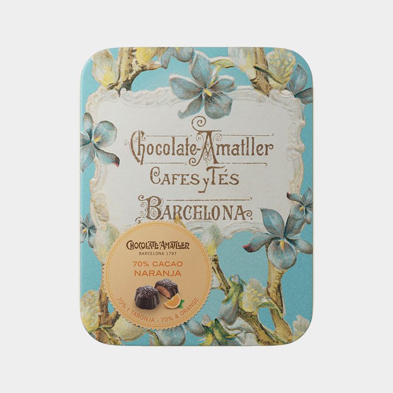 The perfect chocolates for those who like the combination of chocolate and fruit. Chocolates covered with 70% cocoa chocolate, with a light interior based on natural orange juice. They come packaged inside an airtight thermosealed tray that limits oxidation and guarantees freshness until the moment of opening. Ideal to give as a gift or to share. They are presented in metal boxes designed from old advertising material of the brand.