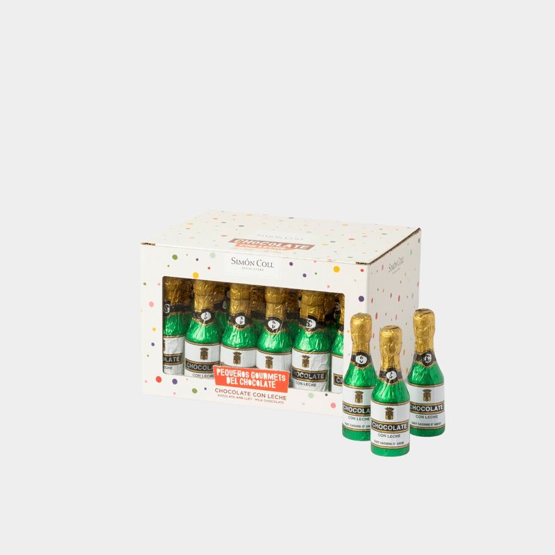 Figura Hueca con forma de botella de 20g envuelta en aluminio, elaborada con chocolate con leche 30% cacao siguiendo nuestro proceso tradicional de fábricación desde el cacao en grano. Nuestro chocolate es sin gluten, elaborado con ingredientes naturales y sin aditivos artificiales. Formato de venta caja con 30u.