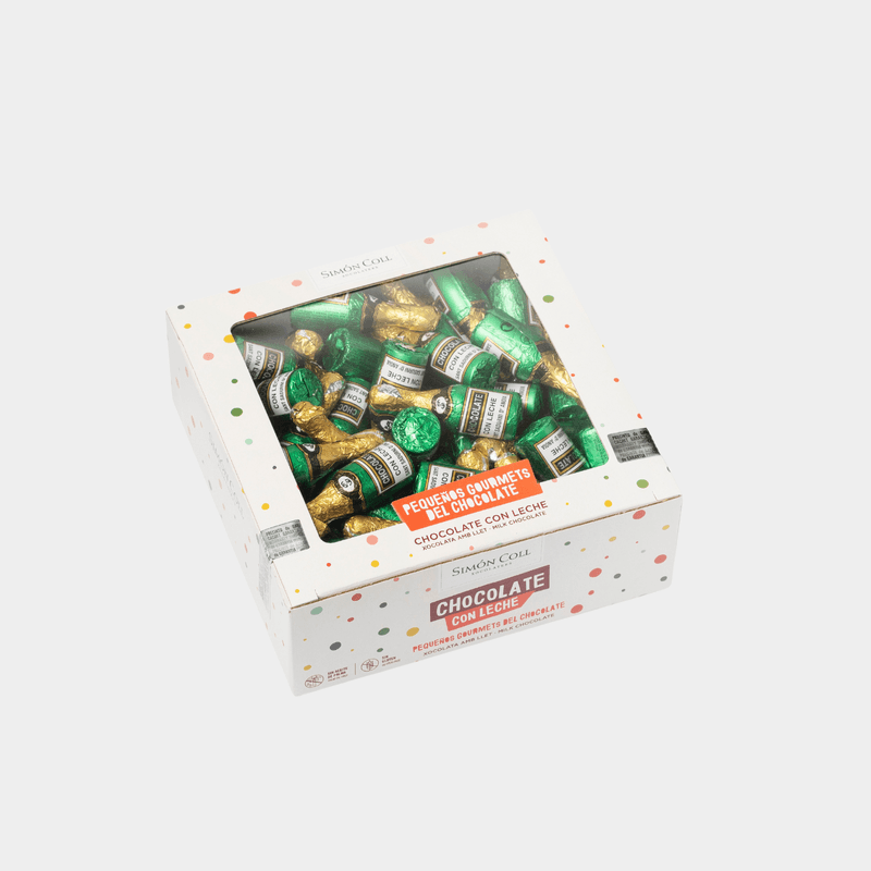 Figura hueca con forma de botella de 8g envuelta en aluminio, elaborada con chocolate con leche 30% cacao siguiendo nuestro proceso tradicional de fabricación desde el cacao en grano. Nuestro chocolate es sin gluten, elaborado con ingredientes naturales y sin aditivos artificiales. Formato de venta caja con 60u.