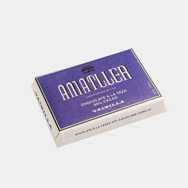 Drinking chocolate. Made with a high percentage of 60% cocoa, with vanilla aroma and corn starch to provide a thick texture. Ideal for lovers of drinking chocolate with a touch of vanilla and a strong cocoa taste. Comes in easily divisible format, with 8 portions of 25g to help with preparation. Inside there are instructions as to how to prepare it. Gluten free.