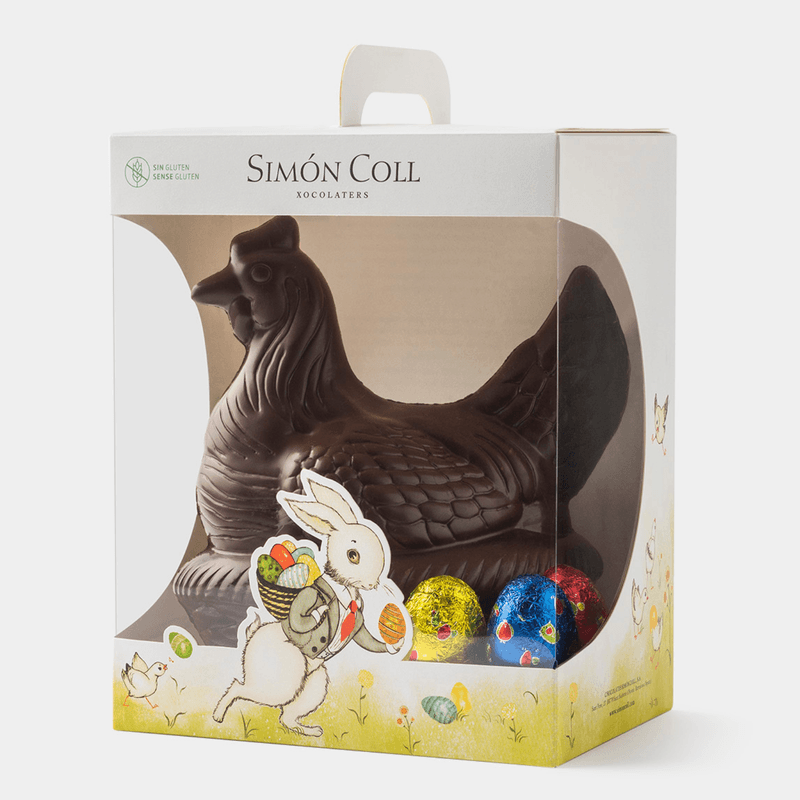 Hollow hen figure made of 250g of dark chocolate, with 3 milk chocolate eggs of 15g each. Packaged in a ready-to-gift box for Easter.