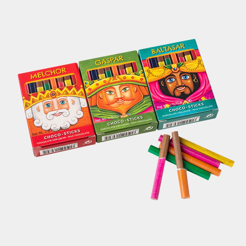 Milk Chocolate Christmas Kings Choco Sticks. Each box has 20g of milk chocolate sticks ideal to share among the small ones of the house during the Magic Kings time for Christmas. Pack of 3 20g boxes (with 8 sticks each).