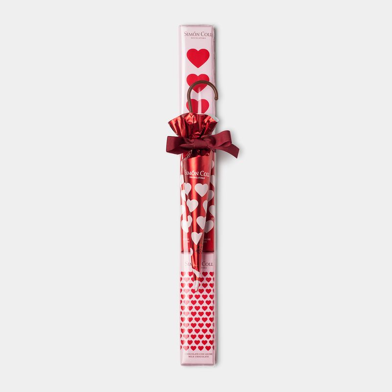 Extrafine milk chocolate. Prepared following the traditional system of roasting from cocoa beans. Ideal for children who love our traditional Simón Coll milk chocolate, as we have kept the same formula, with all the creaminess and smoothness. Presented in a pack of three 18g bars plus an umbrella of 35g, all of them with a heart design. Ideal to give as gifts at any time when you want to show your love or for special days like Valentine's Day.