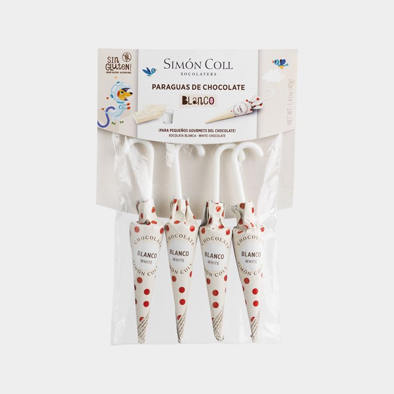 Bag with 4 white chocolate umbrellas of 10g each. They are made from 100% cocoa butter. For you to enjoy the typical creaminess of Simón Coll white chocolate.