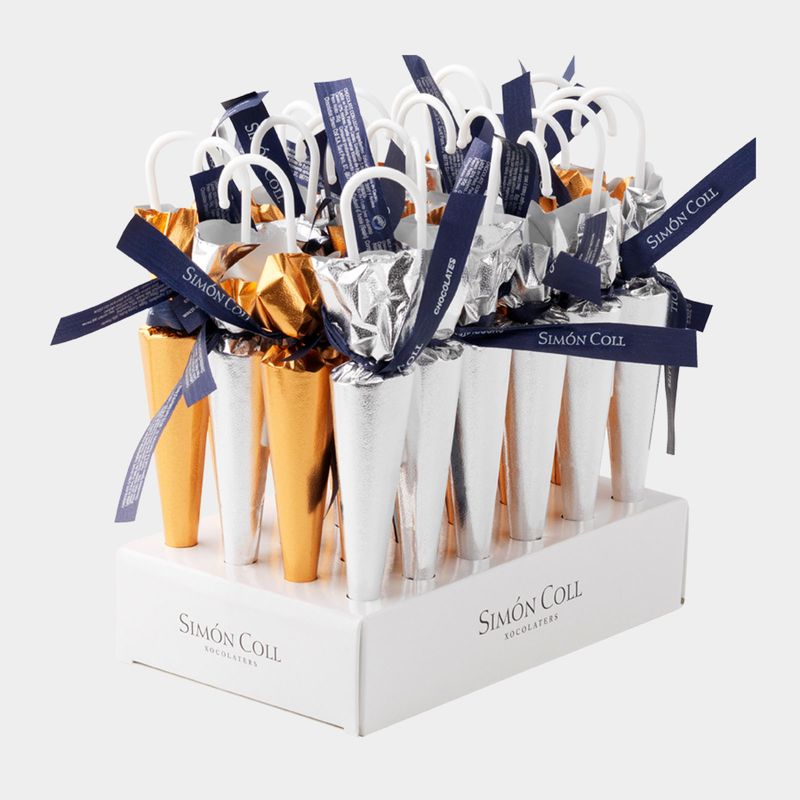 35g umbrellas with gold and silver designs, made with Simón Coll milk chocolate. They are made with 32% cocoa, following our traditional roasting system of cocoa beans. For those who love the creaminess and the flavour of Simón Coll milk chocolate. Our chocolate is gluten free, made with natural ingredients and without artificial additives. Ideal to hang on the Christmas tree and for everyone in the family to enjoy to the fullest and with the peace of mind that this is a quality product from Simón Coll. Sales format: 35g umbrellas.