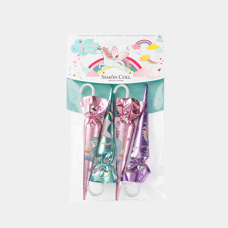 Bag of 4 milk chocolate umbrellas of 15g each. There are 3 different models themed with unicorn designs. Children will enjoy Simón Coll's creamy and soft milk chocolate while they will discover the fantastic and magical unicorn world.
