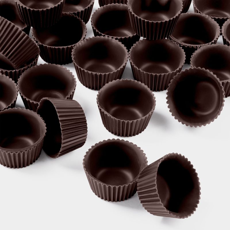 Chocolate negro 50% cacao con un buen balance cacao-azúcar. Son ideales para elaborar pequeñas creaciones estilo petit fours. No contienen gluten por lo que son aptas para celíacos. Envasado en cajas con 432 unidades.