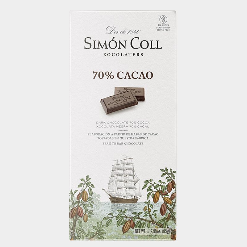 70% cocoa. Made with natural ingredients of high quality and manufactured following the process of selection and traditional roasting of the cocoa bean in the Simón Coll factory. Ideal for lovers of intense flavors and high percentages of cocoa. Free of gluten and artificial additives. It comes in a bar of 85g that is easily divisible, allowing you to taste and enjoy chocolate more easily.