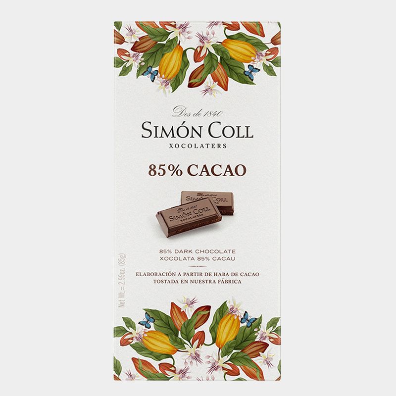 85% cocoa. Made with natural ingredients of high quality and manufactured following the process of selection and traditional roasting of the cocoa bean in the Simón Coll factory. This bar has all the intensity of cocoa, along with a great creaminess in the mouth, allowing you to enjoy the purity of the cocoa and its intrinsic benefits with the pleasure of a high-percentage recipe. Free of gluten and artificial additives. It comes in a bar of 85g that is easily divisible, allowing you to taste and enjoy chocolate more easily.
