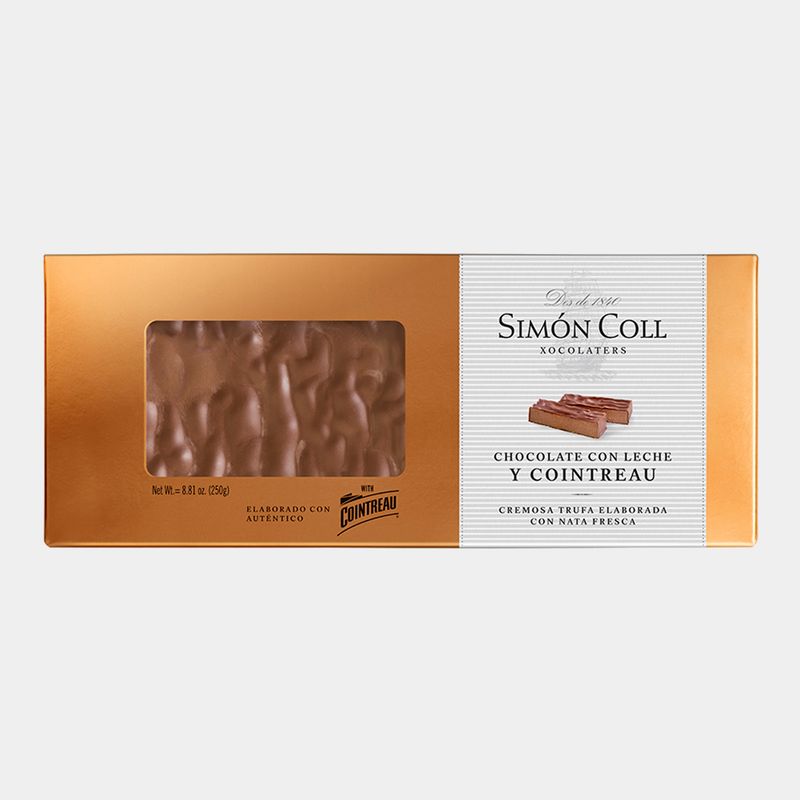 Turron de chocolate con leche y Cointreau. Calidad Suprema. Ingredientes: Azúcar, manteca de cacao, LECHE en polvo (18%), NATA (LECHE) líquida (14%), pasta de cacao, aroma natural (Cointreau: alcohol, agua, extracto de piel de naranja ) (7%), glucosa líquida, estabilizante (E-420, E-407), emulgente (lecitina de SOJA) y aroma natural (vainilla).