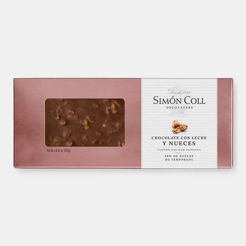 The walnut turrón will be everything you need this Christmas: creamy and crunchy on the palate, you will notice the fresh chopped seasonal nuts inside and how they melt with the Simón Coll extra-fine milk chocolate. Have we not yet convinced you to flaunt it on your Christmas table this year?