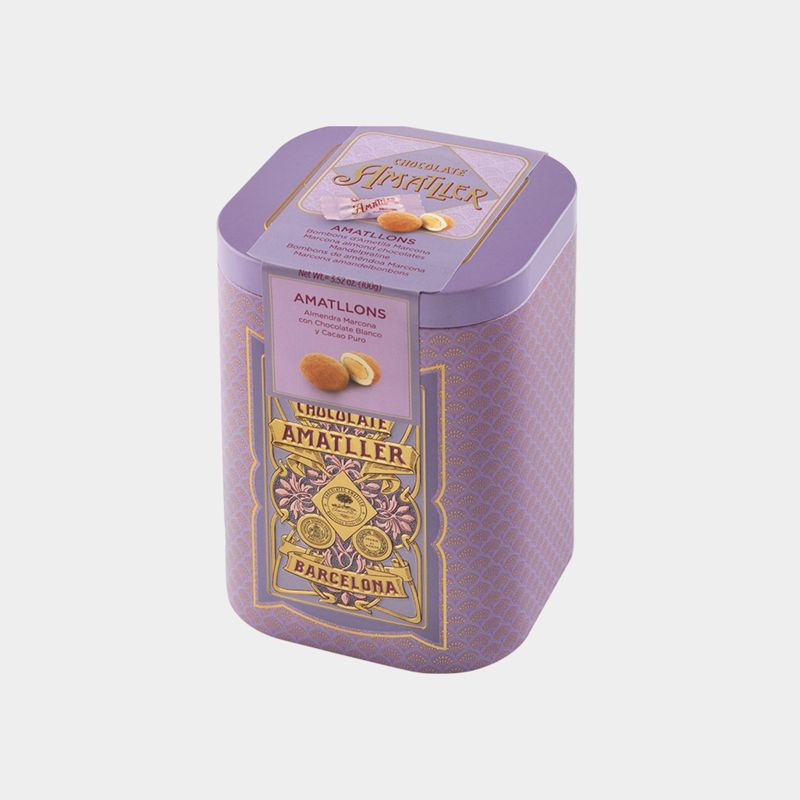 Una irresistible combinación de texturas y sabores en el paladar. Almendra variedad Marcona, tostada y caramelizada, recubierta de chocolate blanco y espolvoreada con cacao puro. Se presenta en un estuche regalo metálico con 100g de Amatllons, diseñado a partir de un antiguo material publicitario Amatller.