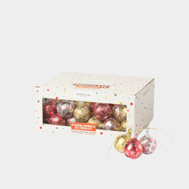 Bolas de chocolate con leche 30% huecas por dentro y con recubrimiento de aluminio con diseños navideños de diferentes colores. Cada bola lleva incorporada un hilo lo que las hace ideales para poder colgar en el árbol de navidad o decorar cualquier espacio de la casa durante las fechas navideñas. Formato de venta: caja de 60 unidades, 12g cada bola de Navidad.