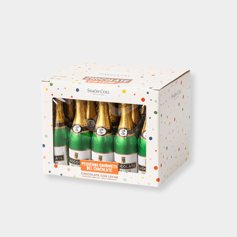 Figura Hueca con forma de botella de 40g envuelta en aluminio, elaborada con chocolate con leche 30% cacao siguiendo nuestro proceso tradicional de fábricación desde el cacao en grano. Nuestro chocolate es sin gluten, elaborado con ingredientes naturales y sin aditivos artificiales. Formato de venta caja con 20u.