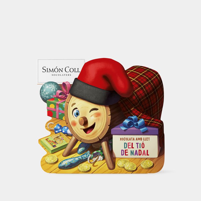Celebra la tradición del Tió de Nadal con una caja surtida de chocolates pensada para regalar al niño. En la ilustración, el Tió —con su barretina y mantita— guiña un ojo y presenta sus tesoros: 2 monedas, 2 sombrillas, 2 sardinas de chocolate y 1 estuche de choco-sticks del Tió de Nadal. Es el detalle perfecto para acompañar la tradición, sorprender en la mesa de Navidad o premiar momentos especiales durante la espera.