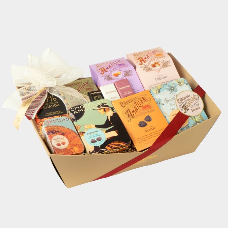 Cesta con 3 tabletas (70g), una con un 85% de cacao origen Ghana, una con un 70% de cacao origen Ecuador y la otra de cacao aromático orgánico de Perú con un 83% de cacao, 1 tableta (85g) con un 50% de cacao, 3 chocolatinas, una de chocolate blanco, una de chocolate con leche y la otra con un 85% de cacao origen Ecuador, bombones de crocant (chocolate con praliné de avellana con un punto salino al final), bombones de naranja en una lata metálica, hojas con un 70% de cacao y sal de mar, amatllons y 1 lata pequeña metálica con hojas de chocolate con leche. Esta es una cesta para regalar en aquellas ocasiones dónde sobran las palabras y reinan las emociones.