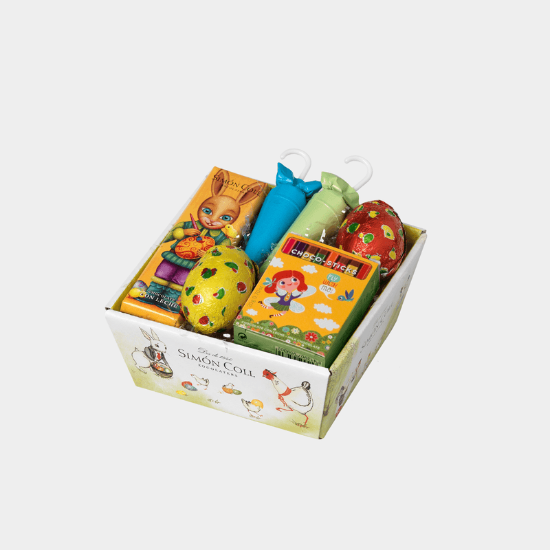 Cesta pequeña de Pascua con agrupación de diferentes productos de chocolate con leche. ideal para regalar como un detalle más para los niños durante el día de Pascua.