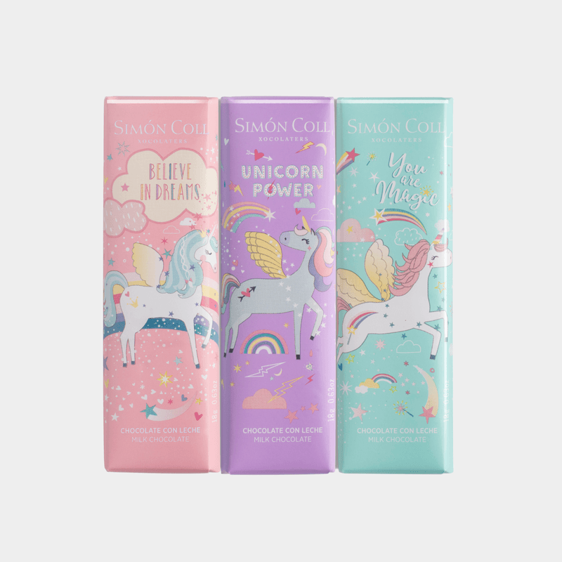 Chocolate con leche fórmula extrafina. Elaborado siguiendo el sistema tradicional de tostado a partir de cacao en grano. Ideal para los niños amantes de nuestro tradicional chocolate con leche Simón Coll, con toda la cremosidad y suavidad. Se presenta en una agrupación de 3 chocolatinas de 18g, con diseños de unicornios, cada uno de ellos con su propia personalidad. Ideal para fiestas de cumpleaños, como regalo para niños/as en bodas, bautizos o comuniones, o simplemente como un premio para los más peques.