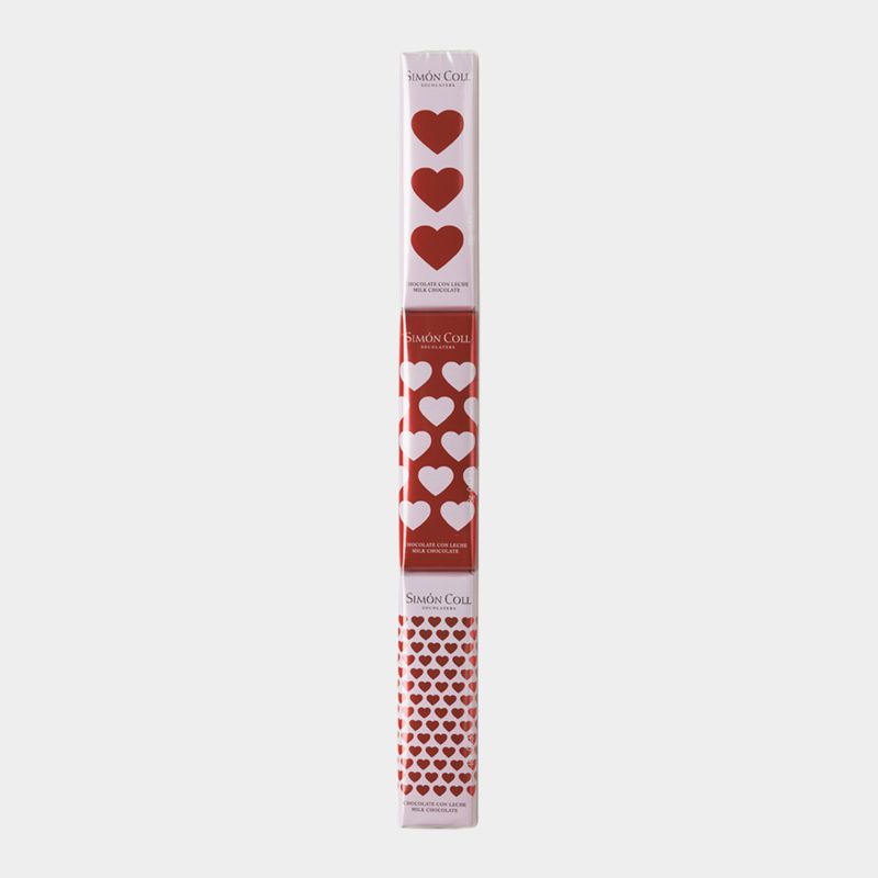 Chocolate con leche fórmula extrafina. Elaborado siguiendo el sistema tradicional de tostado a partir de cacao en grano. Ideal para los amantes de nuestro tradicional chocolate con leche Simón Coll, ya que hemos mantenido la misma fórmula, con toda la cremosidad y suavidad. Se presenta en una agrupación de 3 chocolatinas cada una de 18g con diseños de corazones. Son ideales para regalar durante cualquier momento del año a alguien que le quieras demostrar tu cariño o para fechas especiales como el día de los enamorados.