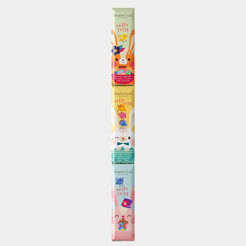 ¡3 NUEVOS personajes acompañan la chocolatira de Pascua! Un conjunto de 3 chocolatinas de chocolate con leche de 18g cada una con diseños de tres simpáticos y divertidos conejitos sobre un fondo de colores pastel.