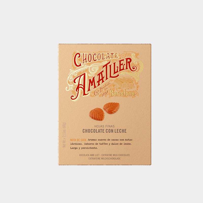 Deliciosas finas hojas de chocolate con leche , elaboradas con habas de cacao, siguiendo el método propio tradicional de selección, tostado, refinado y conchado, estas finas hojas se caracterizan por ser una equilibrada combinación de la intensidad del cacao y la cremosidad de la leche, todo ello con un ligero toque de vainilla natural. Vienen envasadas en el interior en una bandeja termo sellada con efecto hermético que limita la oxidación y garantiza su frescor hasta el momento de su apertura. Ideales para consumir en casa solo o acompañado. Se presentan en envase de cartón que facilita su apertura y su abre cierra para consumir el producto en el momento que más apetezca sin necesidad de una vez abierto terminártelo.