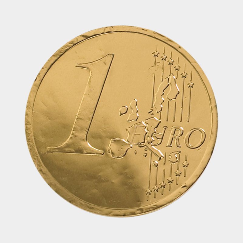 Medallón de 60g de chocolate con leche 32% cacao con diseño de una moneda de 1€.