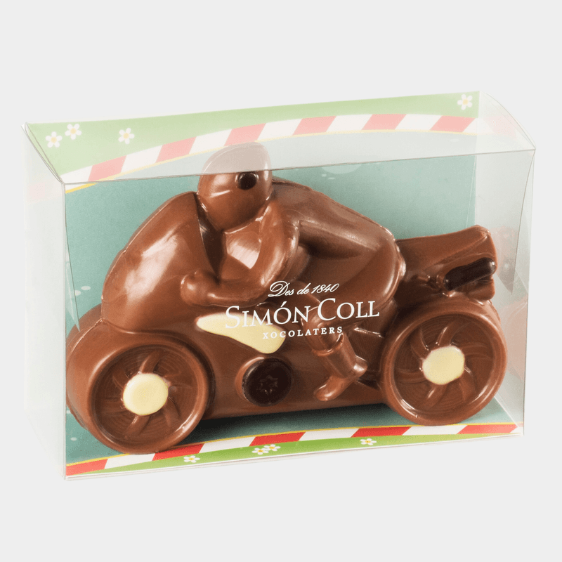 Figura de una moto de chocolate con leche. Figura hueca pintada a tres colores con chocolate con leche, blanco y negro. Ideal para decorar la mona de Pascua.