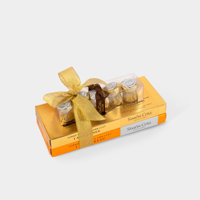Pack surtido con 2 turrones y bombones al Marc de Cava. Los turrones son de chocolate con leche, uno con Cointreau y el otro con avellanas enteras de temporada. Los bombones están hechos con chocolate 50% cacao con interior de ganache al Marc de Cava.