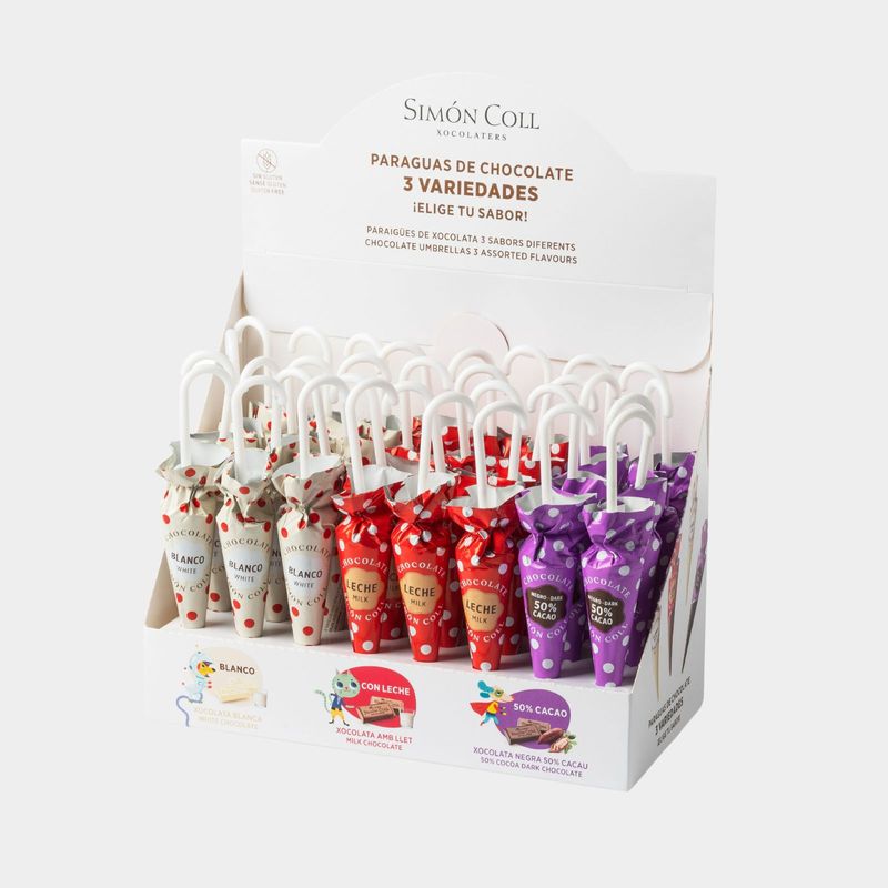 Display con 32 unidades de paraguas de chocolates surtidos (12u de chocolate con leche, 12u de chocolate blanco y 8u de chocolate negro 50% cacao) de 10g cada uno.