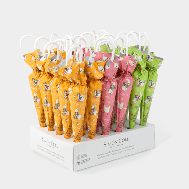 Paraguas de 35g con diseños de conejos de Pascua y de varios colores todos de chocolate con leche de Simón Coll. Están hechos con un 32% de cacao y elaborados a través de nuestro sistema tradicional de tostado del cacao en grano. Para los amantes de la cremosidad y el sabor del chocolate con leche Simón Coll de siempre. Nuestro chocolate es sin gluten, elaborado con ingredientes naturales y sin aditivos artificiales. Ideal para regalar en la epoca de Pascua y para que todos los miembros de la familia lo disfruten al máximo y con la tranquilidad de ser un producto con la calidad de Simón Coll. Formato de venta un paraguas de 35g .