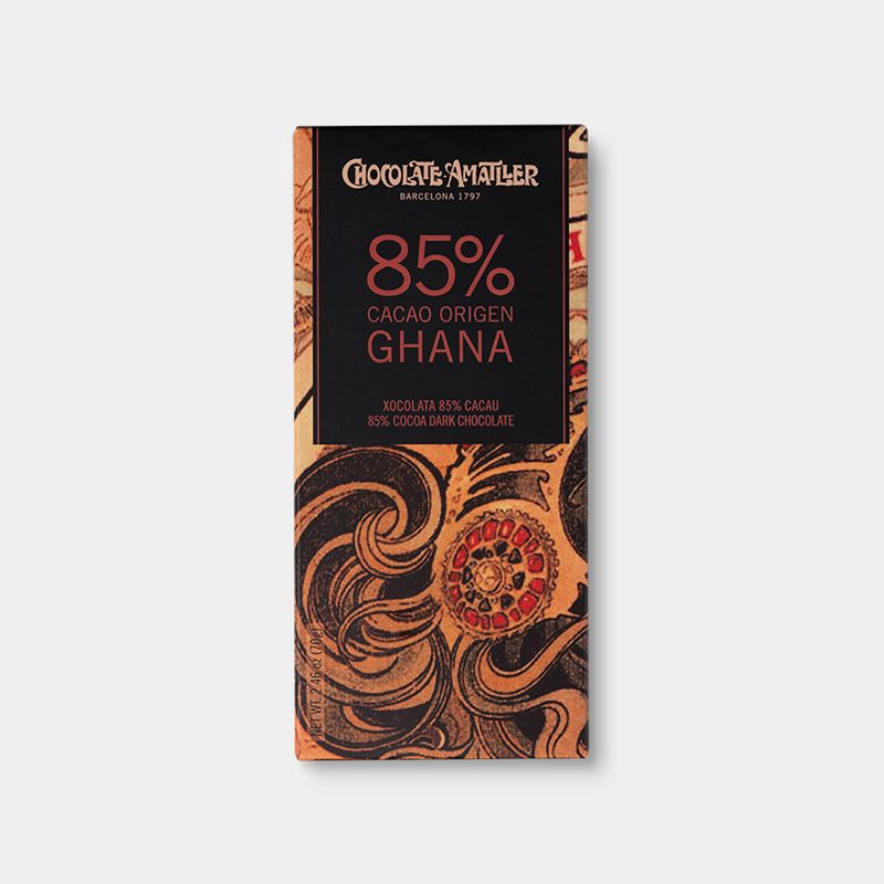 Elaborado con un 85% de habas de cacao origen único Ghana, y azúcar. Para los amantes de los sabores naturales de los cacaos de origen único, sin aromas añadidos. El cacao origen Ghana se sitúa dentro de la variedad Forastero y es un cacao de sabor pronunciado, con alguna nota afrutada y sobre todo notas tostadas de prolongada intensidad en el paladar. Formato de venta tableta 70g.