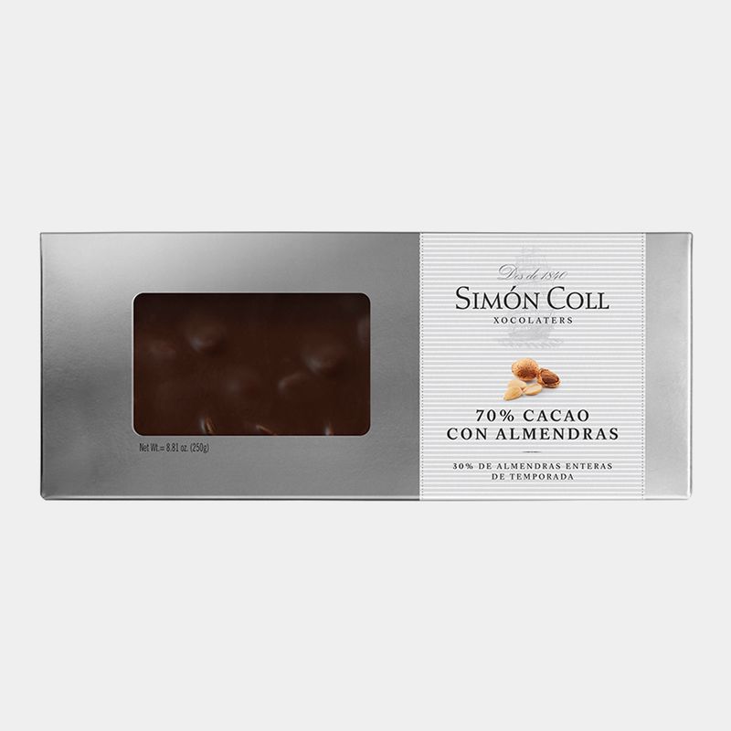 La combinación del chocolate 70% cacao y las almendras enteras resulta en un turrón de chocolate de lo más apetecible que aúna una almendra tostada, de proximidad y sabrosa, y la intensidad del chocolate negro. Deléitate con esta combinación tan especial.